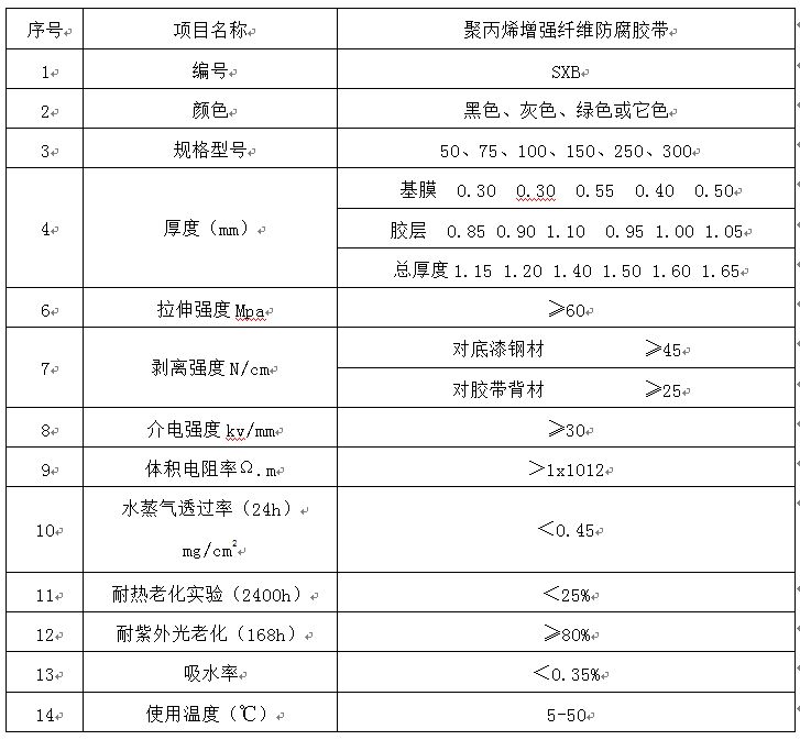 該產(chǎn)品基材為獨特的改性聚丙烯編織纖維布,采用丁基橡膠改性瀝青做防腐膠層。其基材是纖維結(jié)構(gòu)可有效地抵抗由于土壤應(yīng)力而產(chǎn)生的蠕變破壞,經(jīng)老化試驗檢測證明其耐蝕壽命達50年以上,各項檢測指標大大高于SY/T0414—98標準要求,完全達到美國ANSI/AWWAC209-00和NACEMR0274-95指標。是管道冷防腐施工膠帶中的佳選擇,也是防腐經(jīng)濟的選擇。